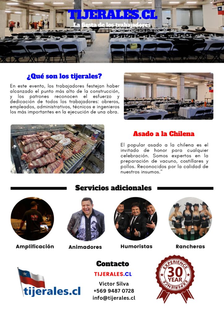 TIJERALES fue iniciada hace mas de dos decadas, siendo pionera en su rubro y a la fecha la mas reconocida en el mercado como especialista en el tema de TIJERALES, todo empezo con la organización de la celebracion para los trabajadores de un edificio que se levantaba en la calle San Pascual, muy cerca de la Escuela Militar. Desde entonces, TIJERALES llega con todo lo necesario: mesas, sillas, cubiertos, parrilla, carnes, vinos y postres. «Este momento es una tradicion especial, que vincula a los obreros con los patrones. Es vital para motivar a la gente». TIJERALES se preocupa de servir bien, y esto es lo que mas le gusta a los trabajadores. No les gusta algo sofisticado, quieren algo simple pero bien hecho. Para TIJERALES los trabajadores son los que mas saben de carne en este pais y TIJERALES entrega el realce y la importancia que merece tal evento.